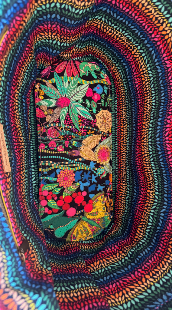 For this Getaway tote version, it features a colorful canvas fabric with a solid quilt cotton contrast accent, plus black cork on the base base and quilt cotton interior lining. Round metal carry handles with an Antique Bronze finish add a distinctive touch to the classic look. The included cork detachable/adjustable strap can be embroidered with accent stitching for no extra charge.